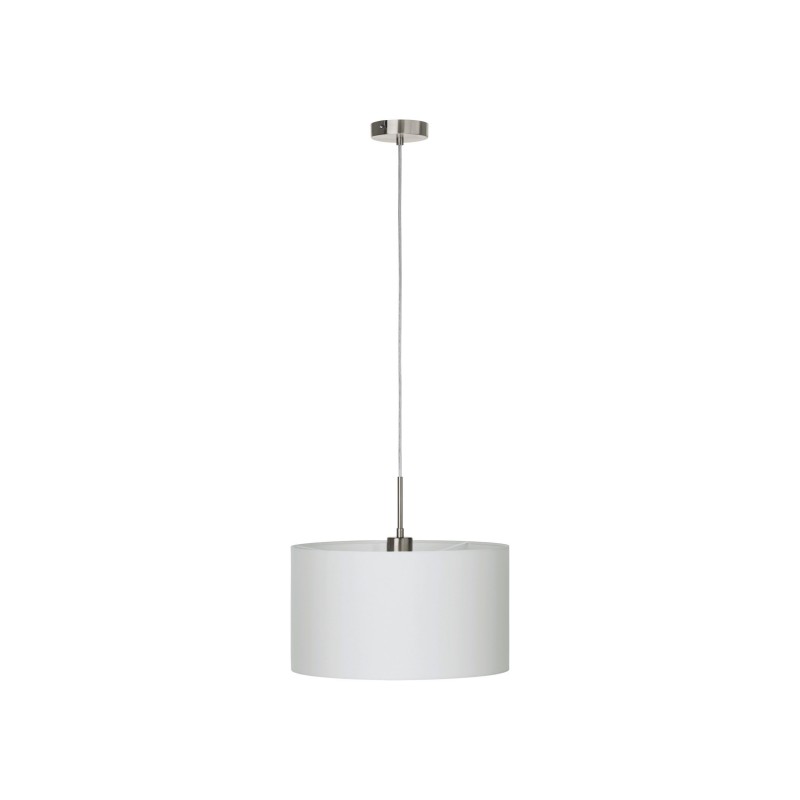 Esta luminária suspensa da série PASTERI é feita de aço de níquel acetinado e tecido na cor branca. O holofote precisa de uma lâmpada E27.